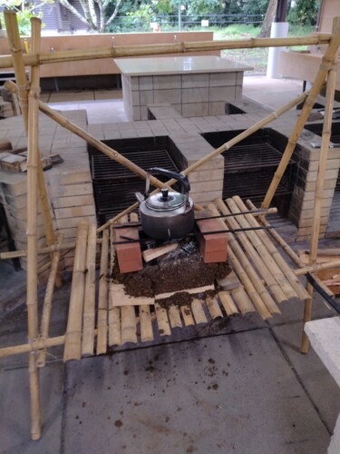 出来上がった「立ちかまど」でお湯を沸かし