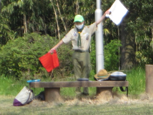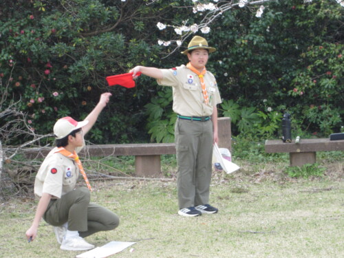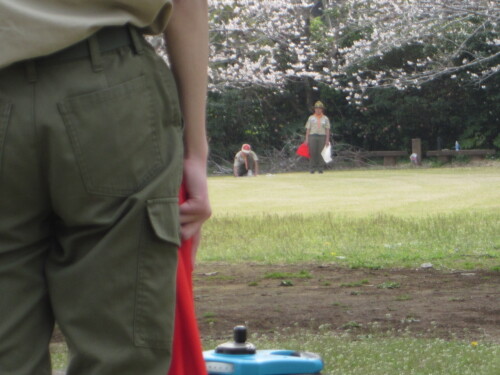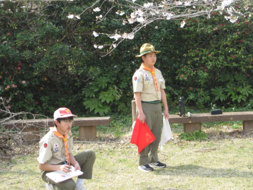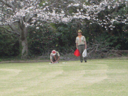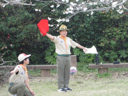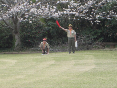 桜の花の下で「手旗」「追跡サイン」を楽しみました。
