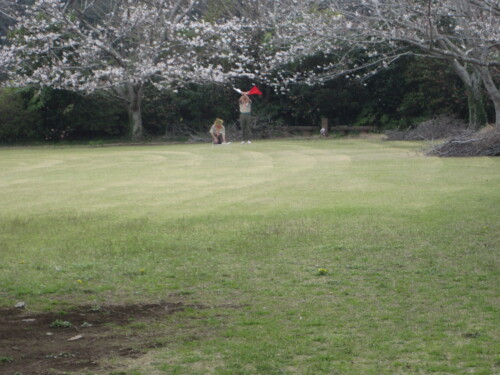 公園を囲むように桜が咲き、桜の木の下 手旗で通信ゲームを始めます。